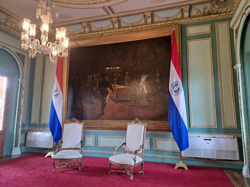 The tour concludes in an extension of the Hall of Mirrors, decorated in mint green and gold ornaments. Here hangs one of Paraguay’s most recognisable artworks: the scene depicted on the back of the 10,000-guaraní banknote, featuring Dr José Rodríguez de Francia at front.