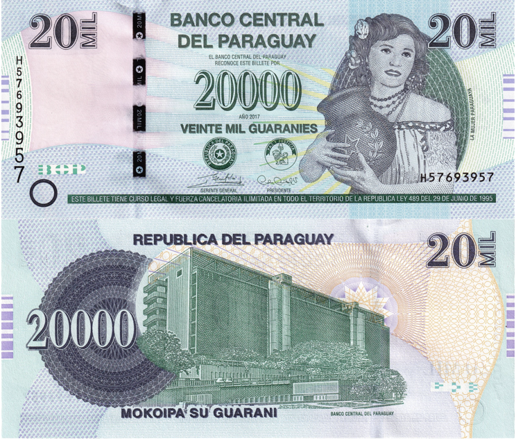 The Gs. 20,000 note features blue and green tones over a multicoloured underprint. On the right, the Paraguayan woman appears holding a clay pitcher, alongside national emblems and the issuer’s name displayed at the top. The denomination appears in both numbers and letters in the corners and centre, with black serial numbers printed vertically on the left and horizontally on the lower right.