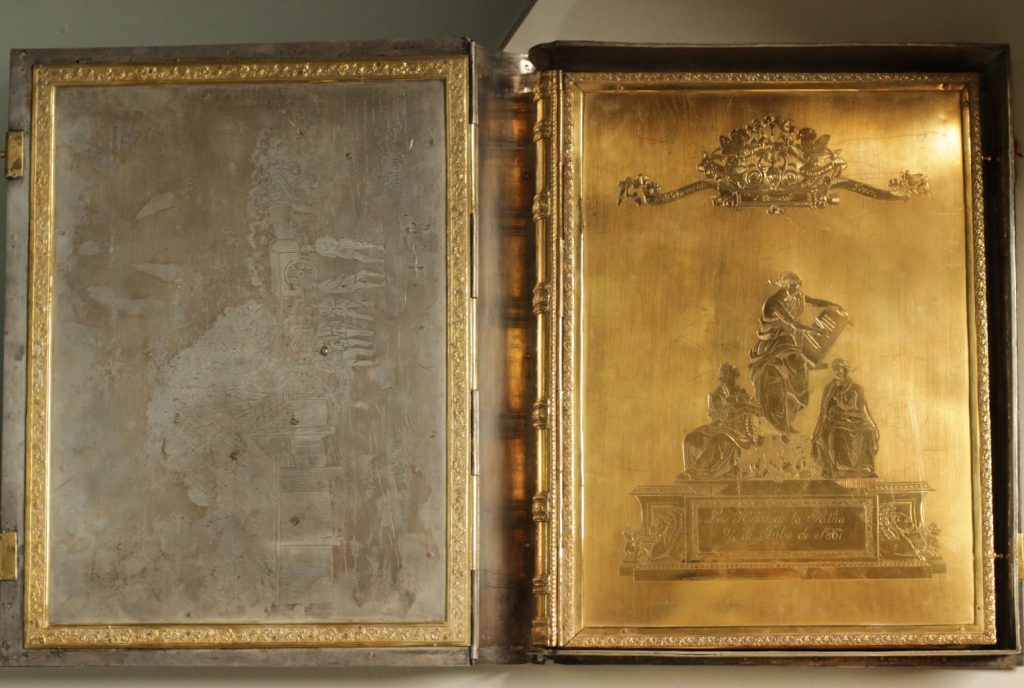 The centrepiece of the exhibition is the Golden Book. The book was presented by Paraguayan women on 24 July 1867 to then-president Francisco Solano López. The book contains signatures and declarations of support for the national cause, showing women’s public commitment during a critical moment of the war.