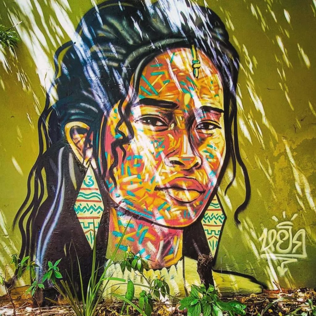 He began by decorating his own walls with leaves, flowers and trees, then moved to portraits and wood panels. “People probably thought I was crazy,” he says, smiling. “But I painted a lot. Those lines I was doing, connected to indigenous culture — they are still in my work today. They have evolved, but they are still my signature.”